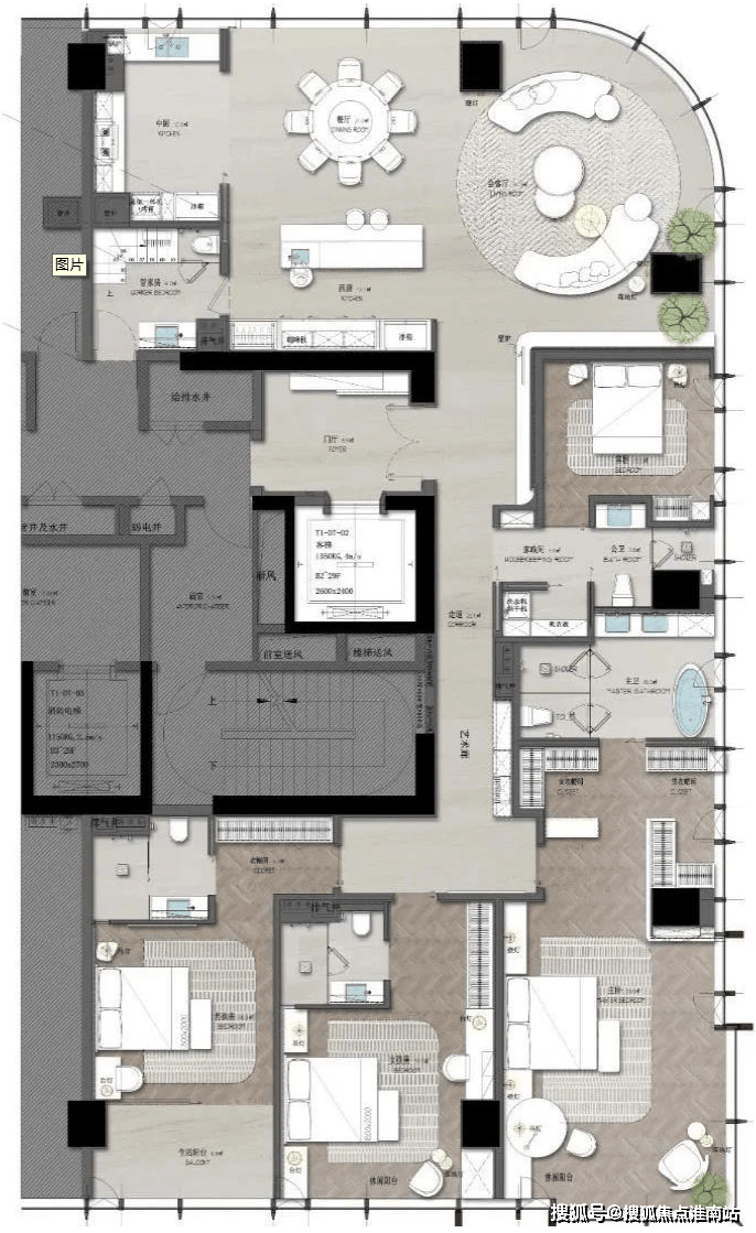 ②层高与梯户配置:层高约 4.2 米,搭配全屋通高柜体、无边框灯具等设计,进一步提升空间的开阔感与奢华感,营造出“奢享”氛围。1 梯 1 户设 计,私享电梯厅,另配保姆梯,保障居住私密性与便捷性。