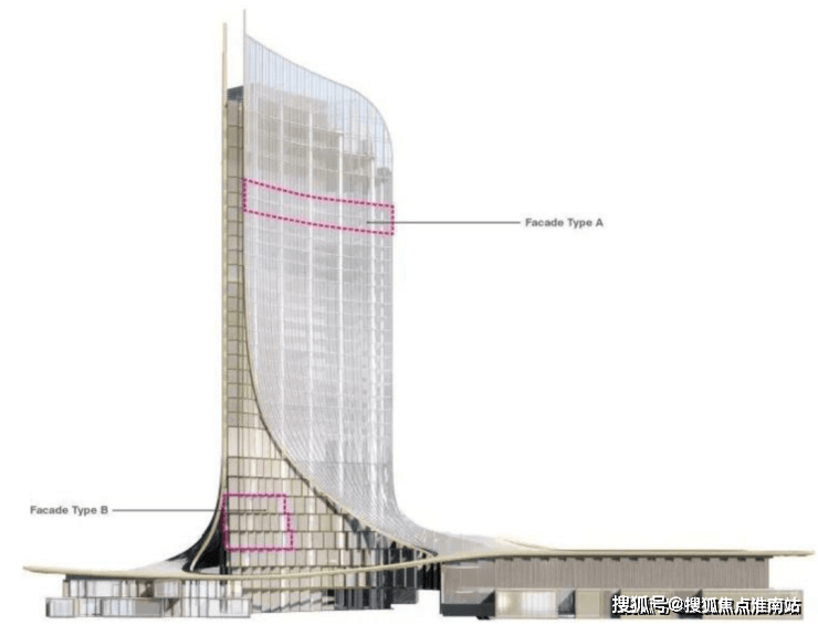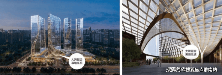 该项目幕墙面积约 12万㎡,由深圳 PAG朋格幕墙负责该项目的幕墙设计。幕墙系统主要有错位单元幕墙、竖明横隐单元幕墙、裙房框架玻璃幕墙、大跨锯齿幕墙系统、标准锯齿幕墙系统、单元幕墙系统、核心筒后单元幕墙系统、球型框架幕墙系统、单元交锯齿幕墙交接位系统等。
