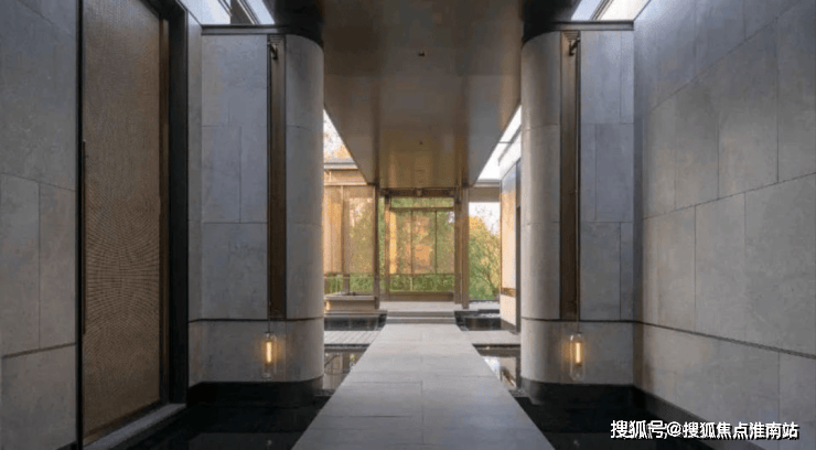 地下车库采用全铝板吊顶、环氧金磨石地面,配备环岛落客区、仿天光照明、司机休息室等设施,提供酒店式归家体验。入口门廊设计古松相迎,光影交织,营造隐奢氛围。