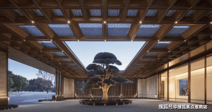 营销中心入口采用“内庭”手法,以“带顶界面+孤植松树”围合空间,强化领域感,弱化硬景装饰性,回应城市美学格调。地下车库设置站台式落客区,搭配水景、绿植和仿日照灯光系统,营造顶奢归家体验。