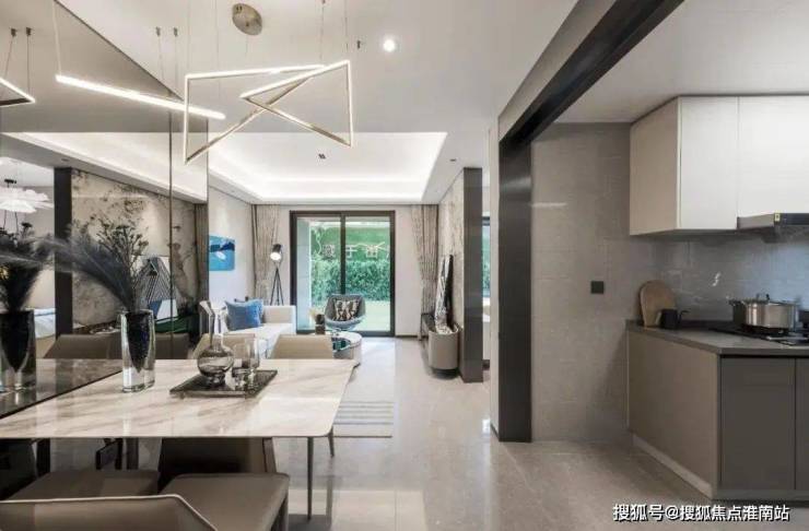 一层南向面宽约3.7米的会客厅,透过落地玻璃窗可欣赏南向花园。餐厅、厨房一体化,操作台面宽绰,动线合理,在一定程度上能够增加与家人的互动。