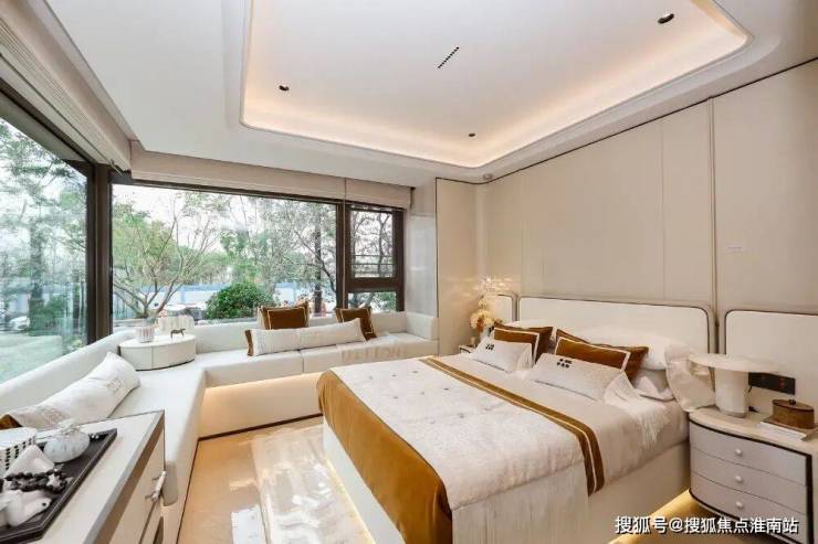 主卧270°景观飘窗几乎无墙垛的设计,定制L型飘窗垫,沿转角的两面墙,安装定制靠垫,再放上1-2个小抱枕就是把飘窗变成“发呆圣地”。