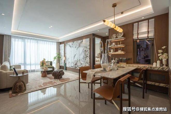 理石肌理与白色调交织相融,构筑起通透基底,焦糖色家具自带温和诗意,与窗外城市景致遥相呼应,共同勾勒出生活的丰盈画卷。