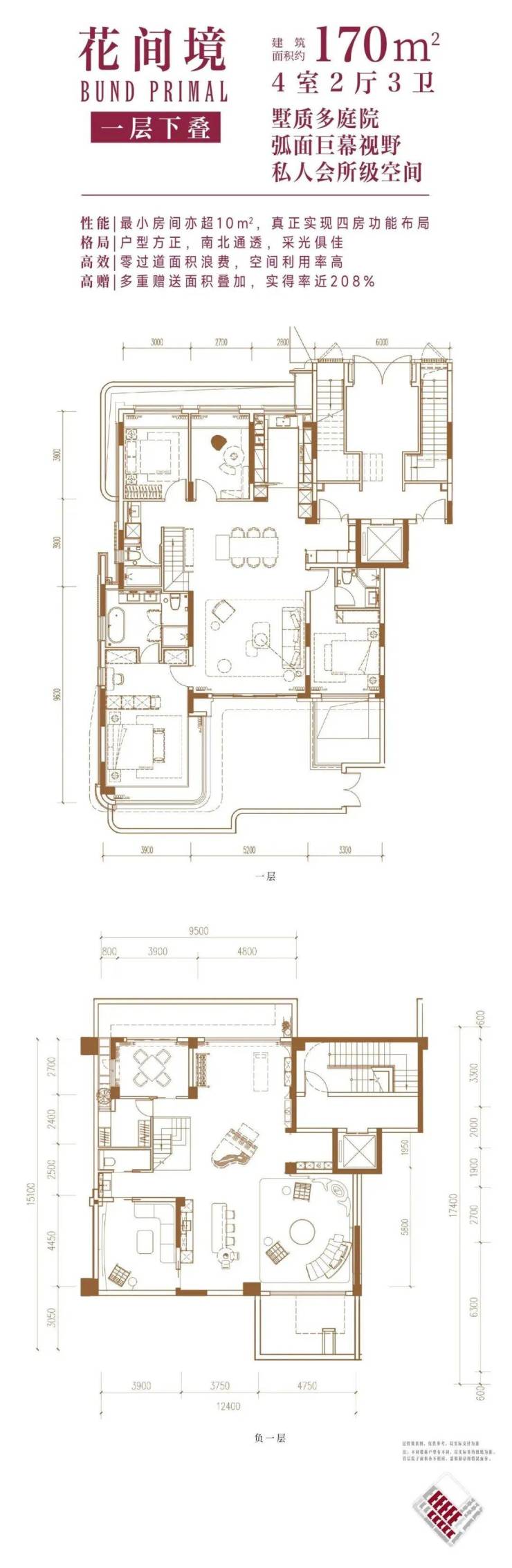 一楼户型附赠花园和超大地下室,地下室还配置两个采光内庭院;二楼户型附赠转角星空露台;三楼附赠露台及其他空间。计算附赠空间后,主力户型三层的实得率能达到约114-210%。
