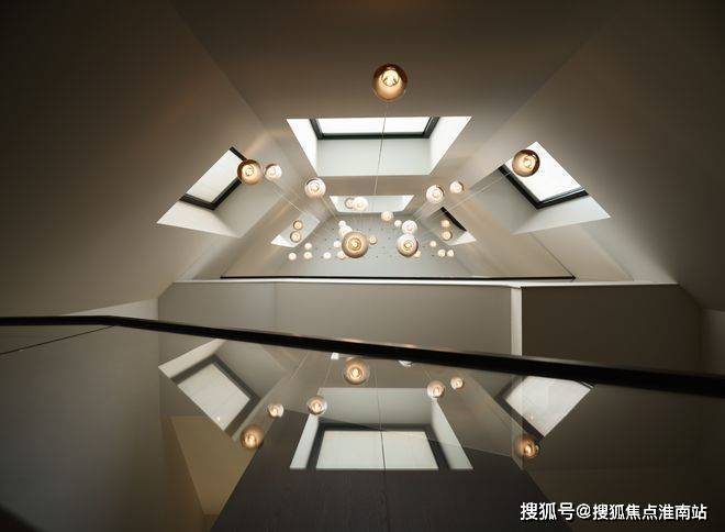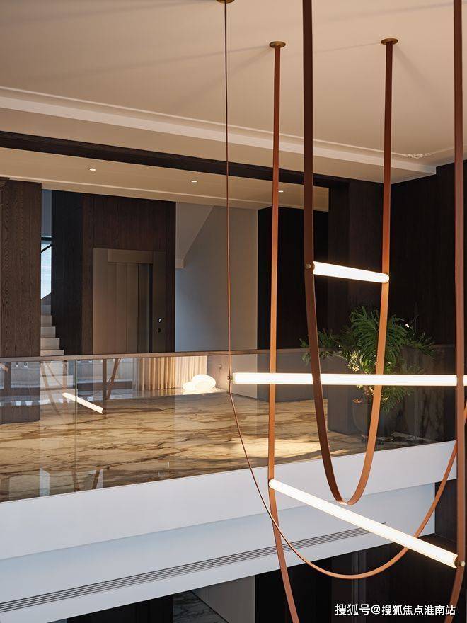 楼梯间水晶灯装置模拟雨滴下坠的瞬间动态,与旋转楼梯的几何韵律共奏空间序曲。