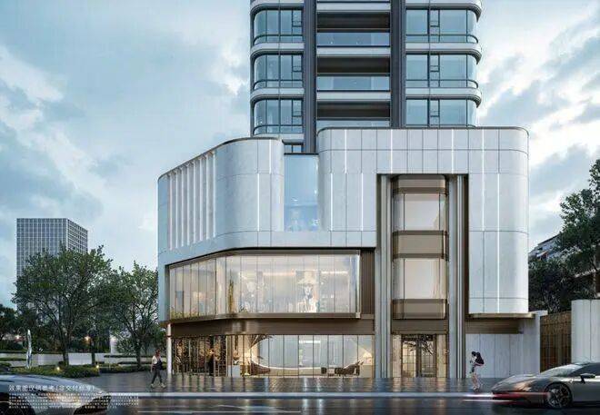 建筑汲取乌达克新古典美学,采用米色石材、白色幻彩铝板,勾勒出典雅高贵的建筑气质,极具辨识度与艺术感.