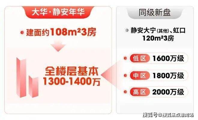 静安大宁、虹口新盘,3房总价约1600万起,若想买中区房源,要到1800万级;而大华·静安年华108㎡3房,全楼层总价基本1300多万,门槛温柔太多。
