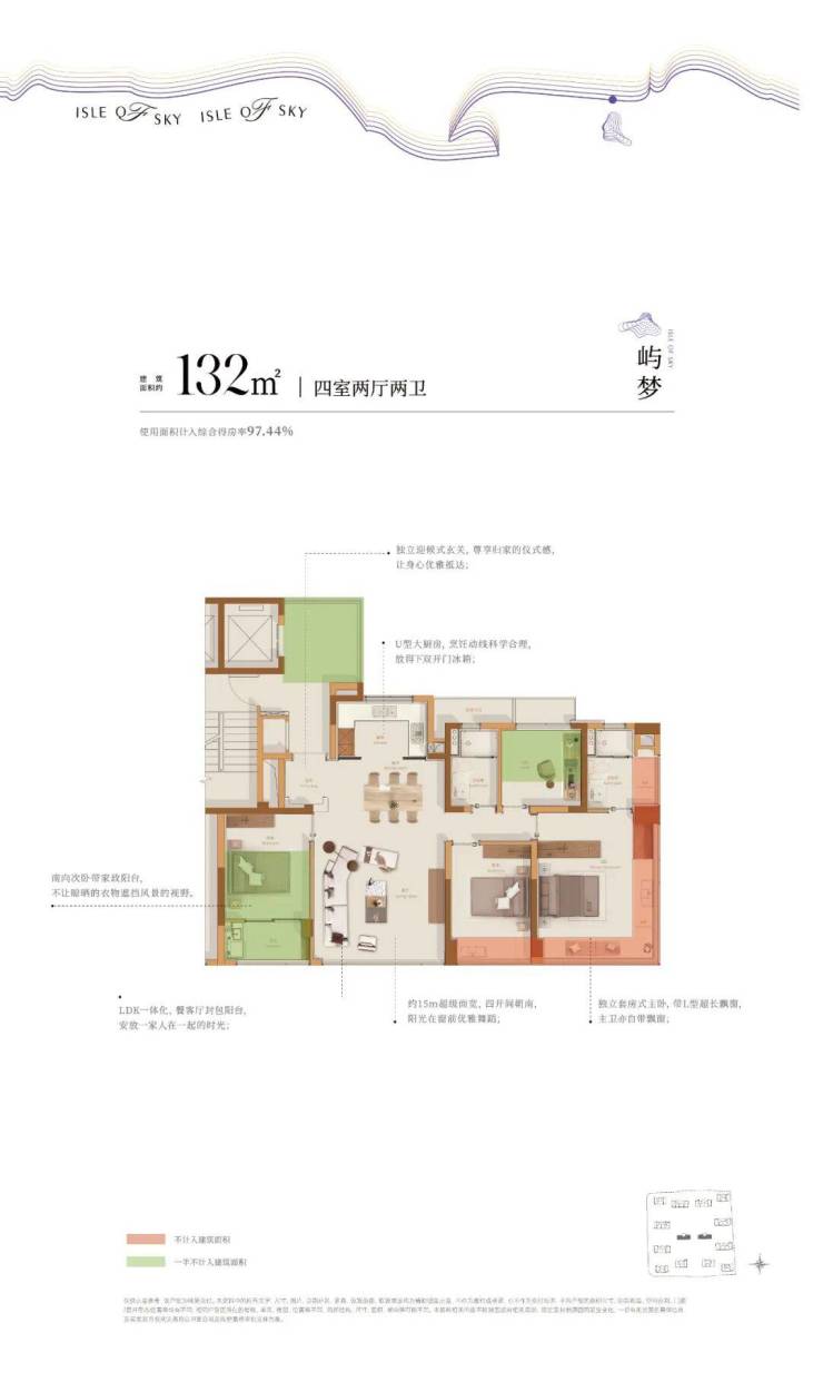 建面约132㎡四房户型,以约97.44% 的超高得房率,更是将此发挥到极致。最令人心动的是,它做到了“类一梯一户”的配置,私密感和尊崇感直接拉满。走出电梯,一个约10㎡的入户光厅便是你的私属领地,大气美观又很实用。走进室内,U型大厨房面宽可达约3.4米,足以容纳家人共同烹饪的欢笑。