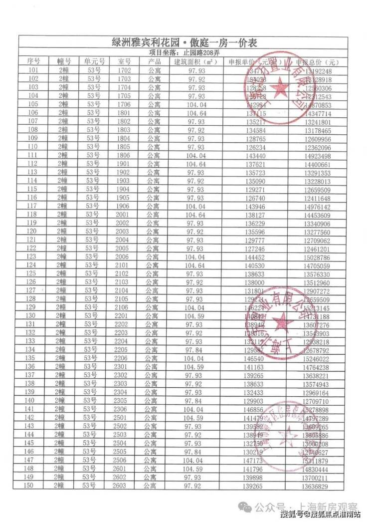 一房一价表如下