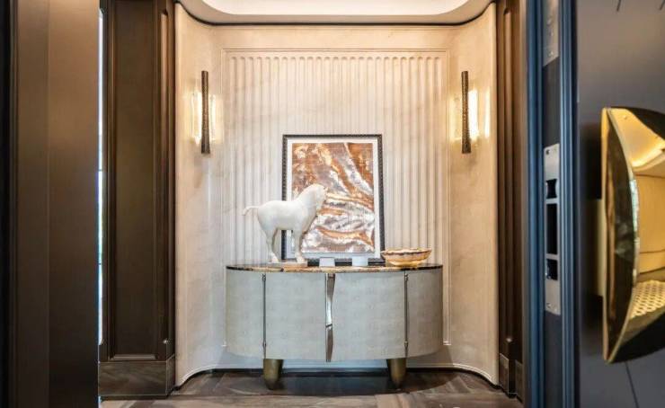 例如入户玄关铺设有“石材皇后”鱼肚印象,这种级别的奢石在很多项目中通常仅作局部镶嵌。