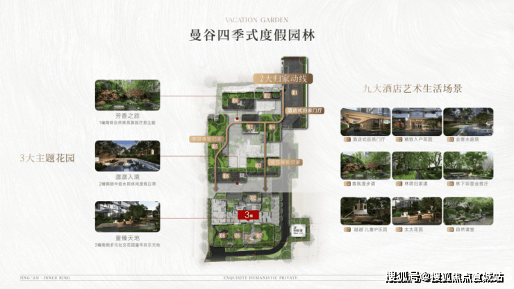 项目汲取曼谷知名酒店灵感,打造了约45m度假酒店隐逸式社区主入口,步入其中,你又会发现,其笔下的园林,并非止步于欣赏,而是糅合了度假、疗愈、奢享的多维功能空间,致献3大主题花园,2大归家动线,构建度假式园林风景。