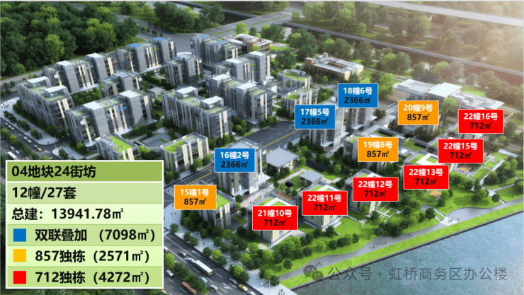 项目分为南区和北区,北区为一期,南区为二期。一期北区共有12栋,单栋面积710~2400㎡,二期南区共有14栋,单栋面积约为856~4800㎡,租售同步。