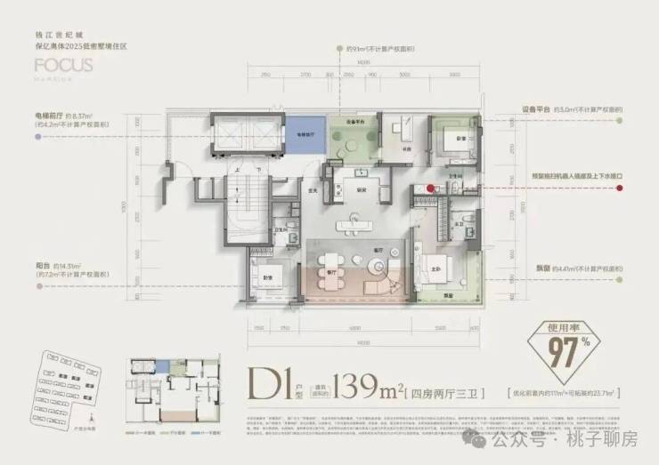 先看 建面约139㎡四房三卫户型。 LDKB的户型设计;封包阳台+主卧L型飘窗;双套卧、三卫;南向超大开间;专梯专户、尊享电梯前厅...
