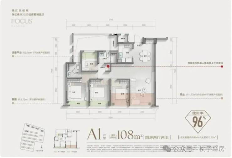 4房灵动布局(北面小房间面宽都有约2.4米),让建面约108㎡的户型,也可实现3.7米面宽开阔竖厅,让一个入门级小户型,也有约40㎡餐客厨空间。