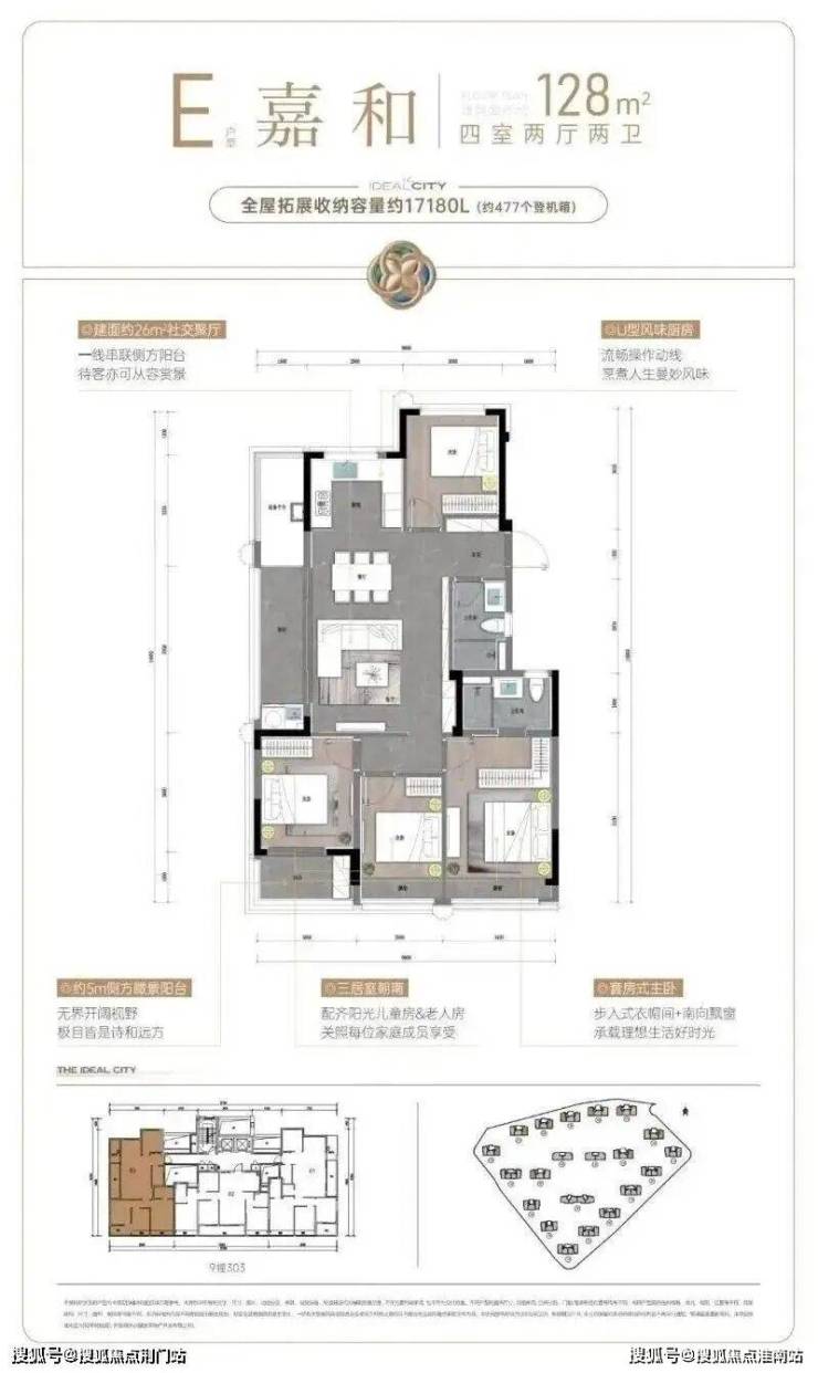 建面约107㎡户型,则把重点放在舒适度上。阔绰方厅+双联阳台,通风赏景至佳,还有U型厨房,三面操作空间,动线流畅好用;套房式主卧更配置了步入式衣帽间,独立卫浴设计,保证了主人家的隐私和仪式感。
