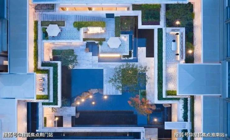 归家动线以环绕下沉式庭院布置。漫步在连廊之上,以水为引再铺陈精选的绿植,随手一拍,松弛气场油然而生。