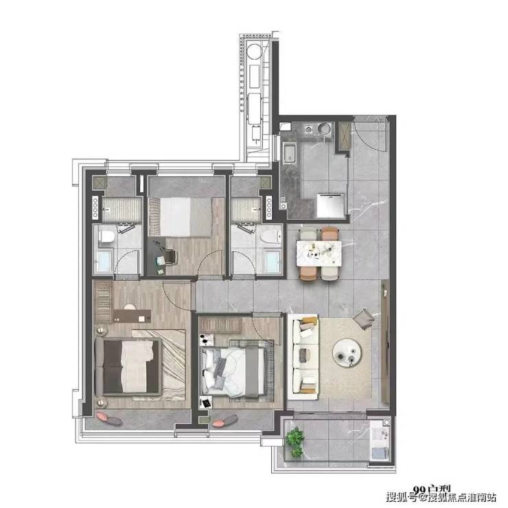 建面约99㎡的三房:在空间上使用功能更加多样化,一站式解决了家庭生活的所有功能,优化居家动线,大大提升空间的居住体验。