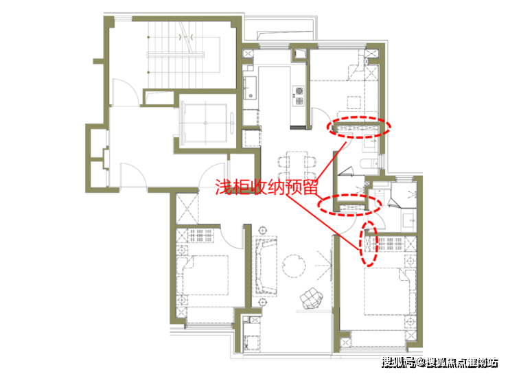 特别的是,这个户型的收纳设计走心了。在卫生间的侧面和主卧门背后、大衣柜侧面都预留了放浅柜的位置,收纳日常高频使用的各种小物件会很实用。