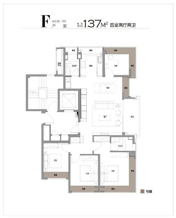 超高得房率户型,飘窗可砸,100㎡A户型,砸完多出约6㎡;137㎡F户型,砸完多出约11㎡,附赠多出来的空间,未来可随家庭需求,灵活延伸。