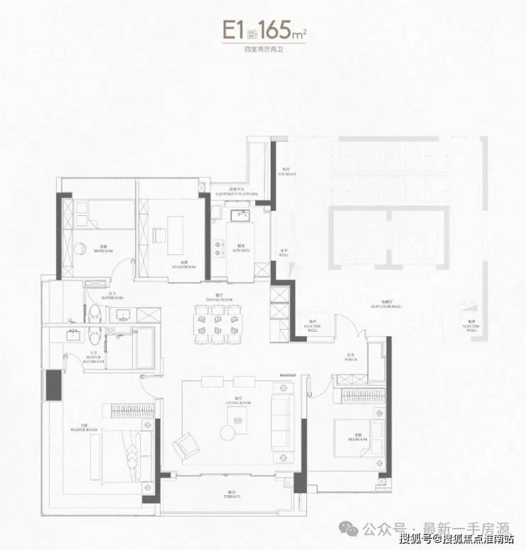 188户型2梯2户,有独立的电梯厅。4房3卫设计,还是3明卫,这两点还是不错的。