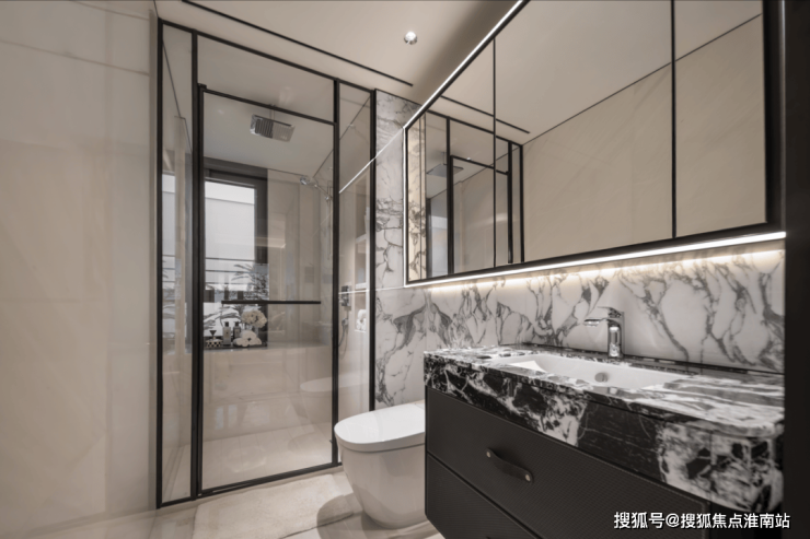 ✔卫生间地面和墙面整体性也非常强,奢石台面的纹路和岩板墙面和协调。