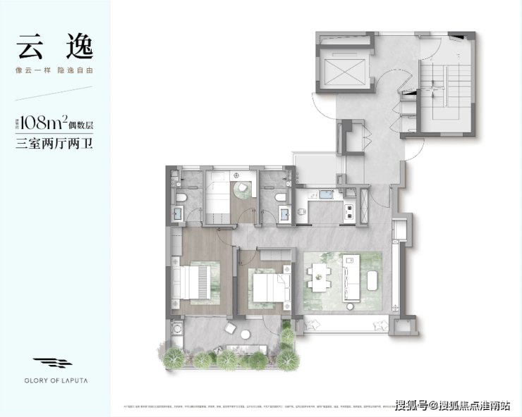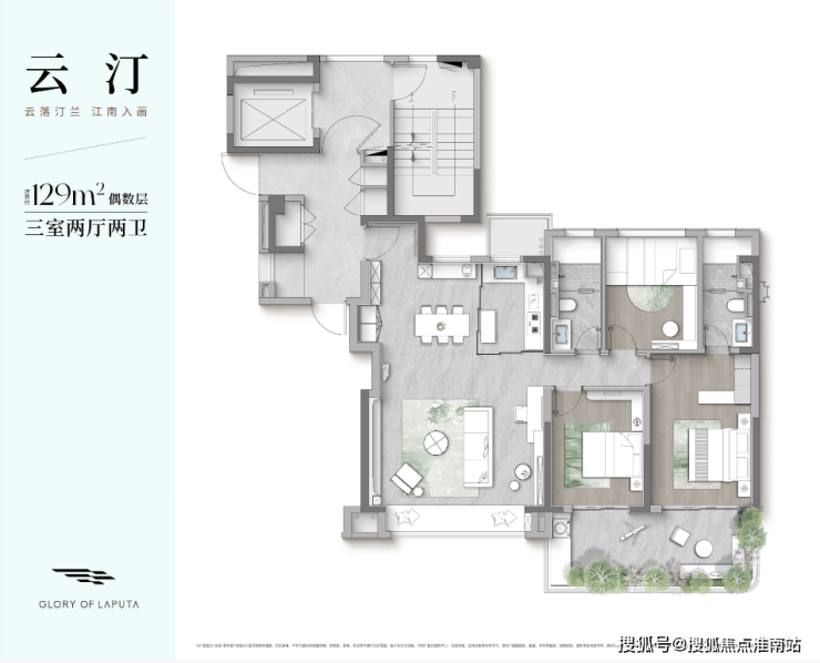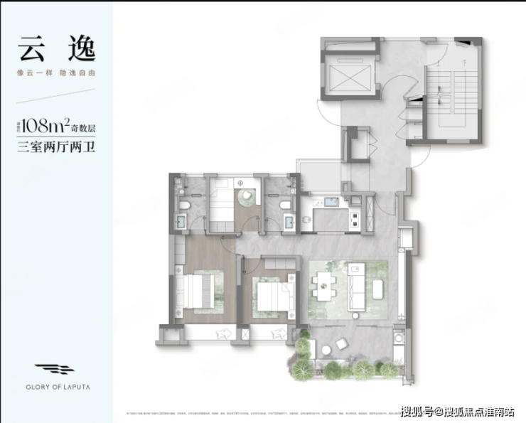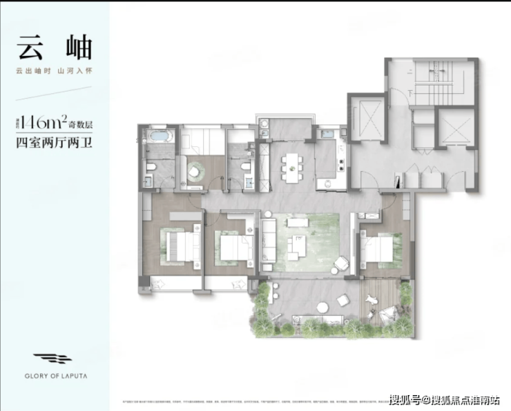 户型点评:4房2卫的房屋套型;偶数层南向超大L型空中庭院;四开间、三卧室朝南设计;偶数层北面有个北庭院;