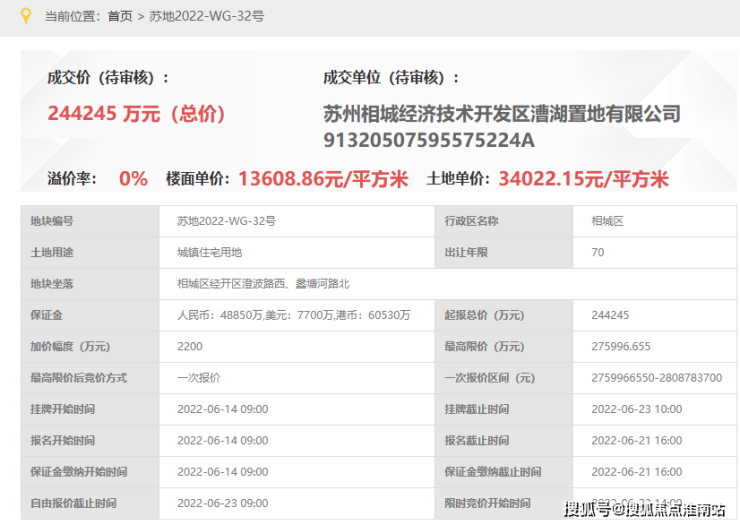 龙湖·峯云境,即苏地2022-WG-32号地块项目, 位于相城区经开区澄波路西、蠡塘河路北,是2022年6月23日,漕湖置地以底价244245万元竞得, 成交楼面价13609元/平。
