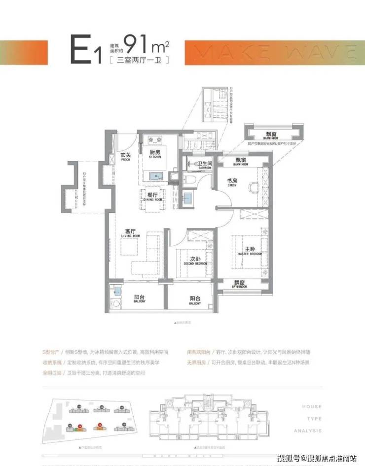 而招商·时代潮派|东屿此次建面约91㎡户型,就做出来了比市面百平户型更好的的“南向双阳台+南北双飘窗”设计。