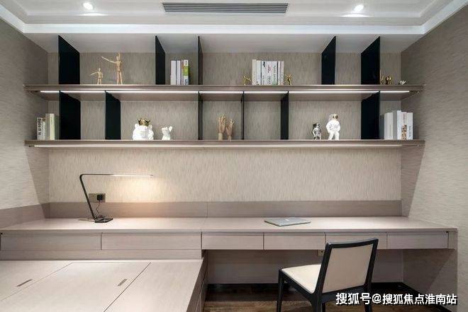 杭州大平层·揽奥云璟售楼处电话☎:400-881-8994(预约看房热线)书架的灯光选择前出光可以有效的照明书架上的物品,上层的是结合顶部的灯带,桌面上由于有这条灯带的照明也有柔和的光源。