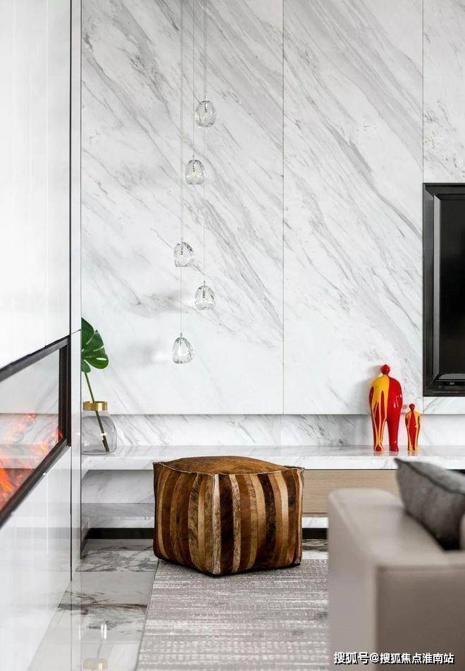 杭州大平层·揽奥云璟售楼处电话☎:400-881-8994(预约看房热线)客厅角落的黄色皮凳丰富色彩呼应了壁炉的颜色。
