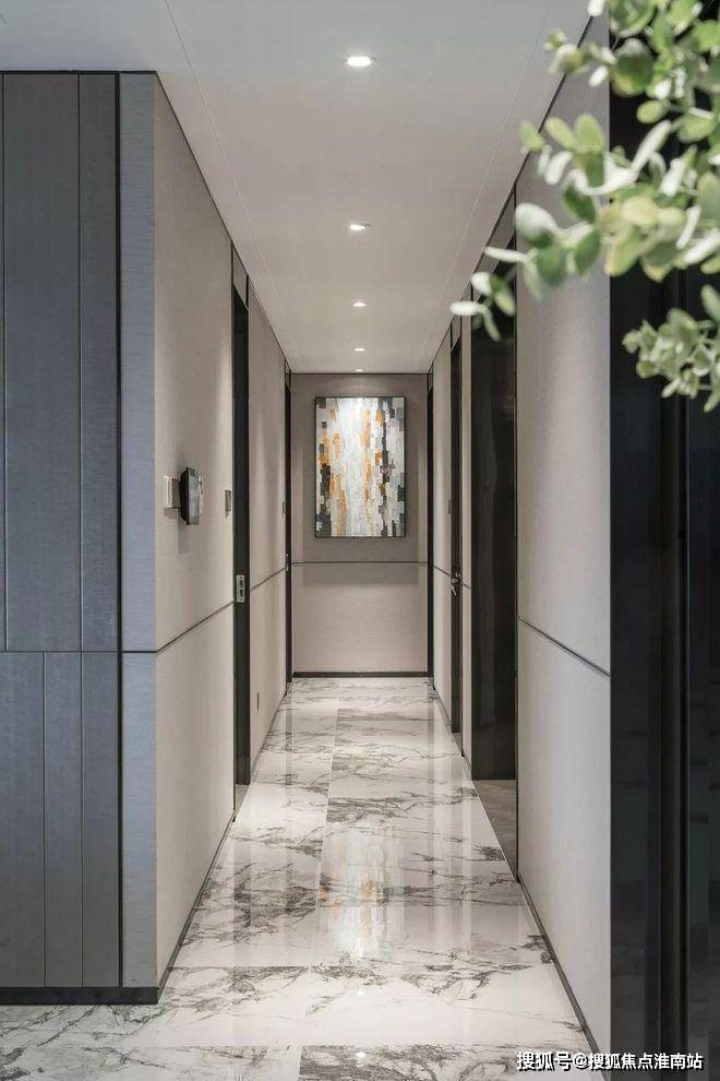 杭州大平层·揽奥云璟售楼处电话☎:400-881-8994(预约看房热线)透过鞋柜看向过道,门全部做了到顶的处理,中间的腰线在公共开放区域是整体贯穿的元素,并结合柜门的开启高度,硬包的中线高度等等做了一个整体的联系。