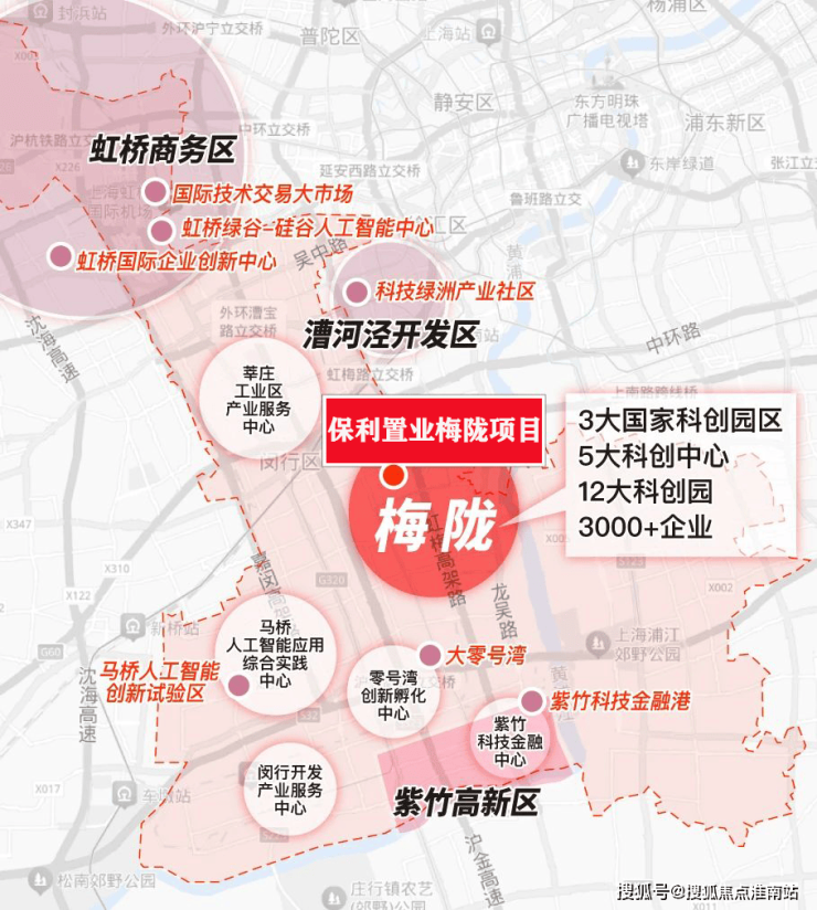 项目位于闵行梅陇板块的核心位置。梅陇周边有3大国家级产业区、5大科创中心、12大科创园、3000+企业,直线距离约7公里范围内拥有漕河泾开发区、紫竹高新技术产业园等科创基地。