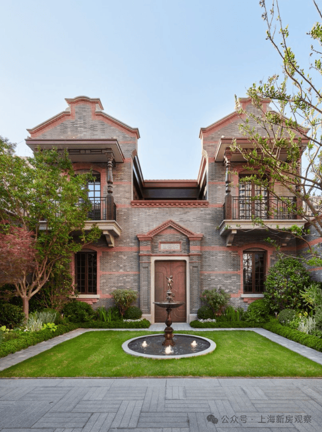 建筑基层石材选用近拟传统皇家建筑所用金山石的世贸金麻,经手工凿毛、酸洗做旧处理,搭配铜质落水管、水纹压花玻璃,每一处细节都在诉说海派大宅的优雅与贵重。
