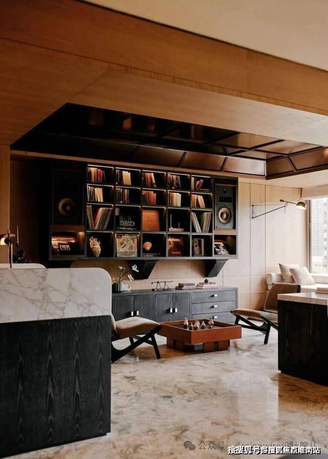 而与之相连的“珍宝阁”书房,打破传统封闭式展陈逻辑,与客厅联动,空间设计以“打开的行李箱”为隐喻,打造无界收藏馆。