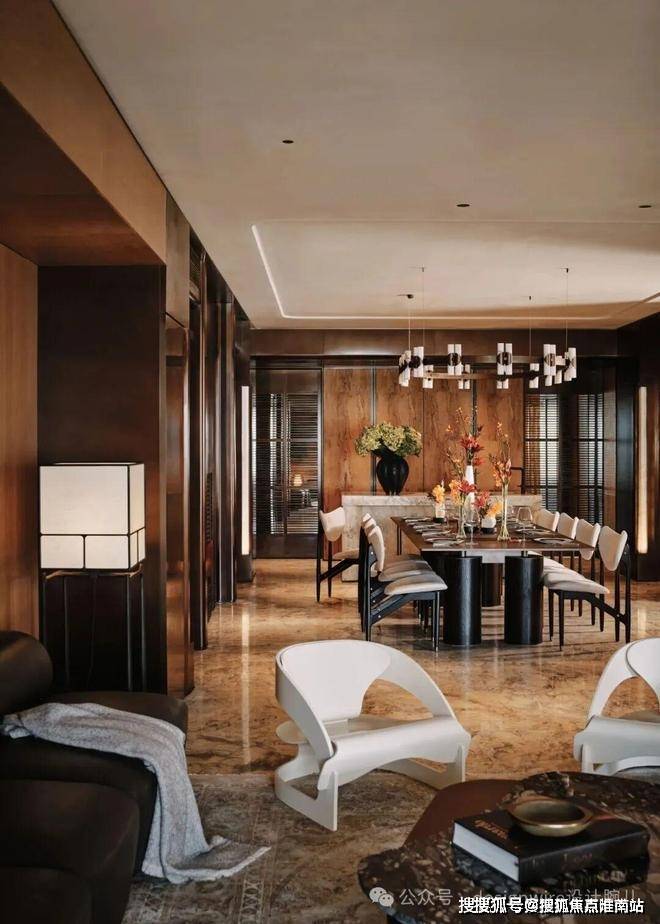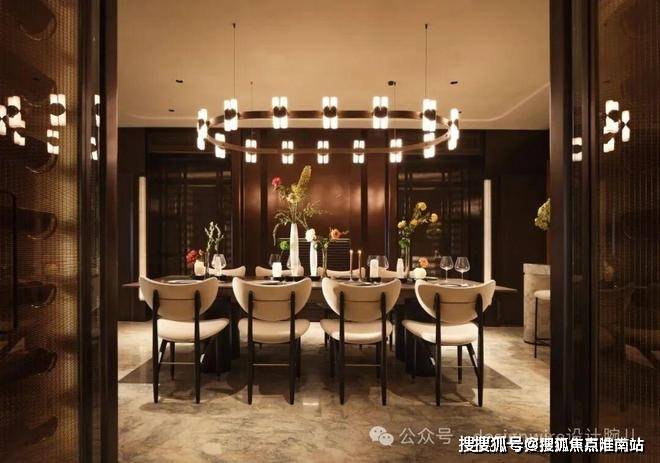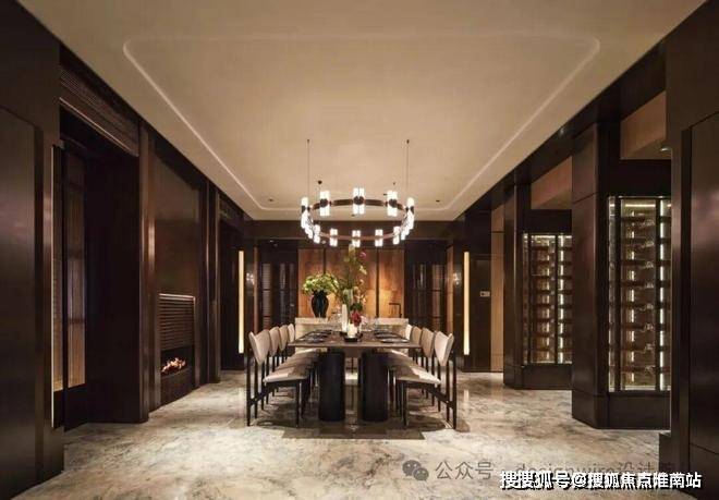 而客餐厅有着别致而深沉的质感,餐边柜✨✨✨【万科傲舍云镜】售楼处热线预约:400-891-9910✔✔✔❤❤❤墙面采用仿古铜不锈钢,配合壁炉燃起,长餐桌与圆轨吊灯在方圆间见气度,令人安心的聚谈随光行进。