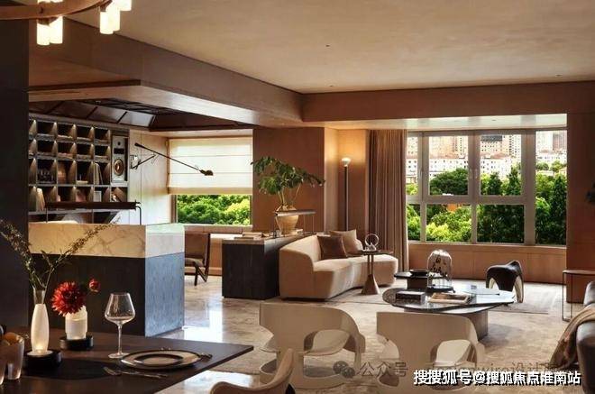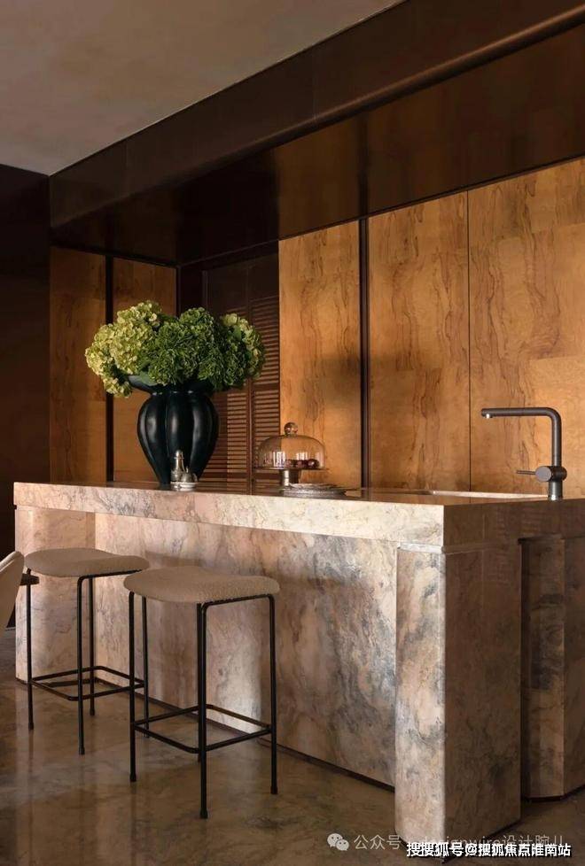 西厨以“从地而生”的手法,吧台与地面采用同款奢石,且左右两侧均有收纳柜及对称的锈镜饰面。西厨背景墙是客餐厅✨✨✨【万科傲舍云镜】售楼处热线预约:400-891-9910✔✔✔❤❤❤区域的视觉焦点,采用橄榄树肌理的树瘤木饰面,透露出经典的意味。
