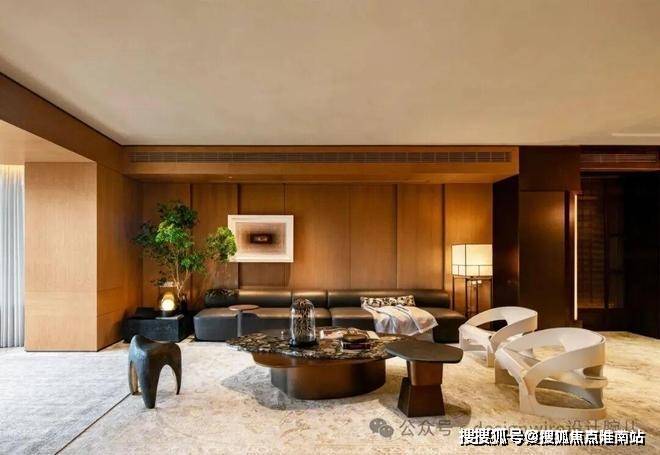 踱步至会客厅,是近100㎡的社交空间,面宽约8米、进深约15米,成就阔绰的家宅尺度。木饰面搭配米色天花,呈✨✨✨【万科傲舍云镜】售楼处热线预约:400-891-9910✔✔✔❤❤❤现出分明舒朗的气质。一字型皮质沙发横向展开,与茶几、坐凳相间,开朗处见逸趣。