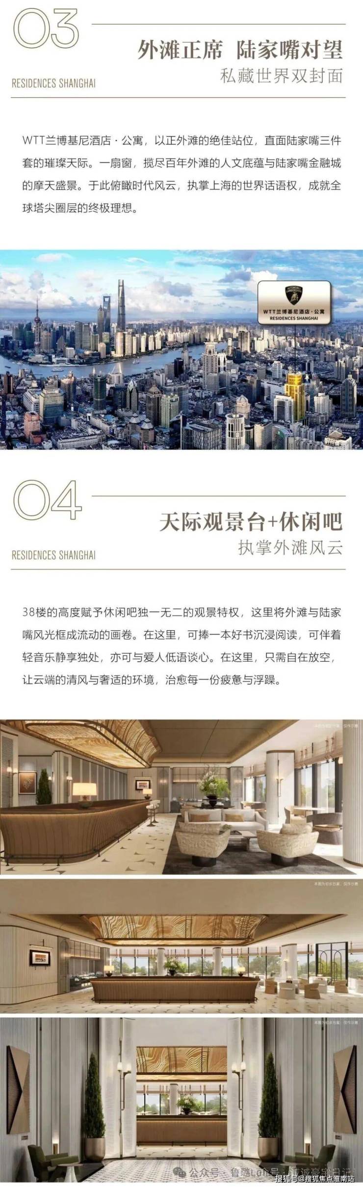 配套:规划私宴、健身房、泳池、屋顶花园等多维度配套,打造圈层私属会客厅; 〔物业服务〕:上海城市物业×WTT兰博基尼酒店双物业,业主专享定制私人管家服务。