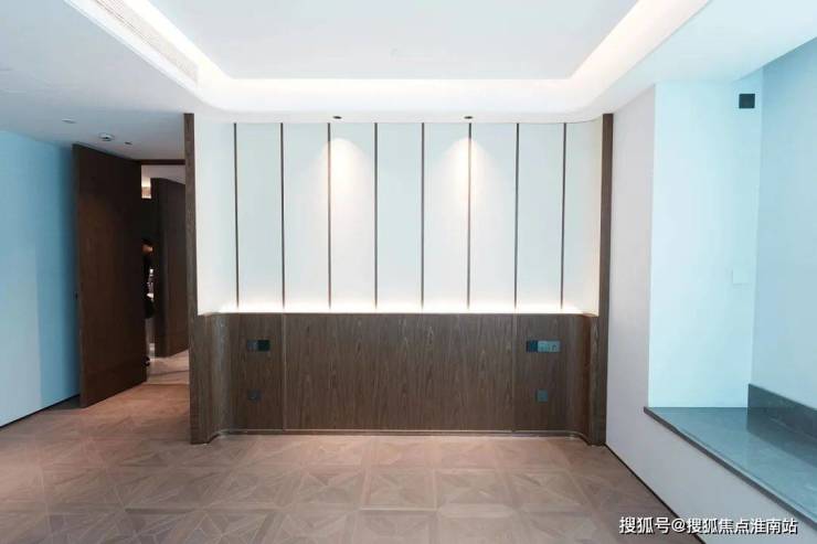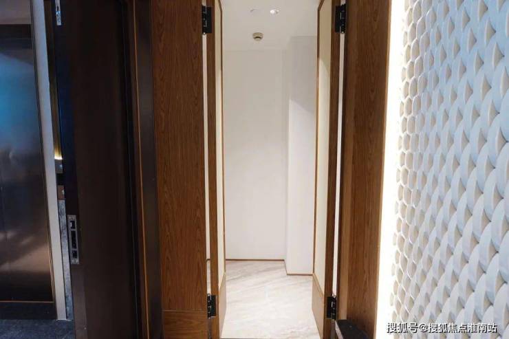 安高这次打造的交付样板间,是从电梯厅开始的。107㎡是一梯两户,电梯间区域,主要以不锈钢条作为通高区域的墙面划分,吊顶带金属弧线。