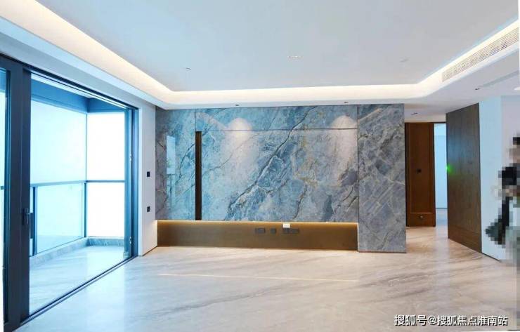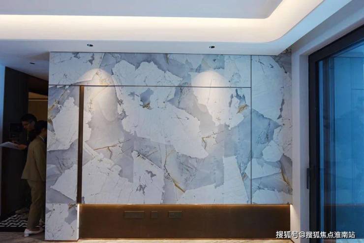 170㎡的客厅电视机背景墙比107㎡更深,但不变的是大理石花纹同样做到了衔接和统一方向,这对工人的要求就比较高了。