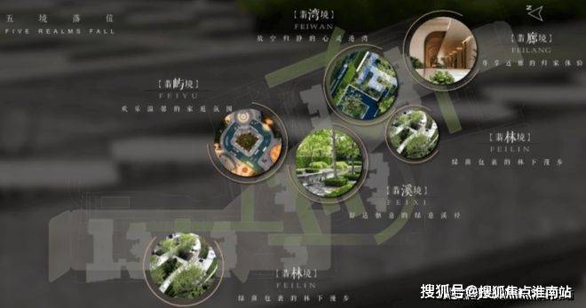 规划了“翡色五境”五大空间氛围,匠造融入时光、人文海派、自然与艺术、家庭与邻里的“四轴、三园、五区、一所”四大功能空间。