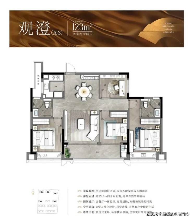 以中间套为例,建面约123㎡的户型做到了主次卧+客厅四开间朝南,伸展开约13.3米的超大面宽,对应双开间阳台与飘窗的设计,进一步提升了全屋的采光。此外,一体化的餐客厅,“一镜到底”活动空间,在视觉上拉大了户型的朗阔尺度。