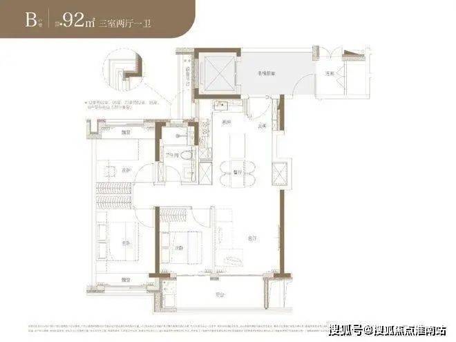 A户型做到了三开间朝南+主卧套房设计+多个飘窗+双联阳台,空间感和实用性拉满。