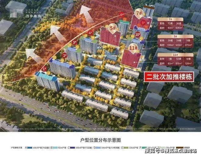 项目二批次加推241套房源,主力建面约92㎡-105㎡-128㎡-136㎡-143㎡3-4房,皆是楼王位置,均价52553元/㎡。