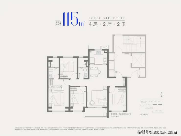 建面约115㎡4房2厅2卫,做到了四开间朝南+全卧室带飘窗+主卧套房设计,一步到位的大四房户型。