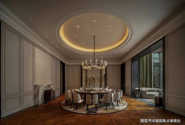 超50米面宽的门庭,以精工定制弧形米黄色大理石为主调,镶嵌典藏级老虎玉大理石,点缀古铜色现代海派艺术感灯器,呈现海派贵雅气质;