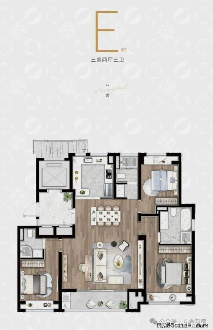 约98㎡3房2卫户型,三开间朝南,并且这贯穿客厅+次卧的超大阳台实在是惹眼,这个南向的视野延展度以及采光度相比同级别的户型来说,要更加出色。
