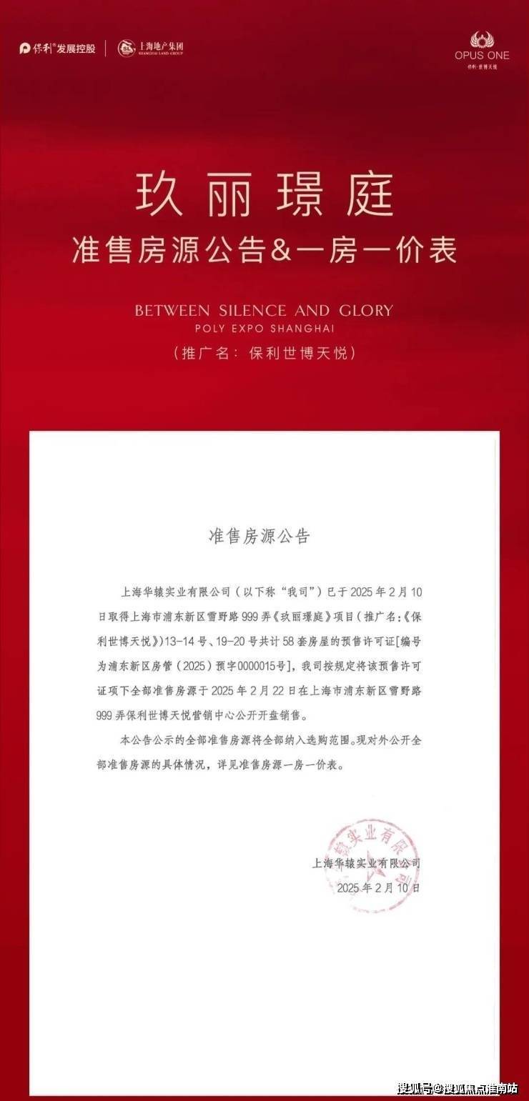1、项目推广名为“保利·世博天悦”,地名核准名/备案名为“玖丽璟庭”,开发公司为: “上海华辕实业有限公司”;预售证号:浦东新区房管(2025)预字0000153号; 2、本资料为要约邀请,不作为要约或承诺;3、相关宣传内容不排除因政府相关规划、规定及出卖人分期规划、未能控制等原因而发生变化;4、买卖双方的权利义务以双方签订的商品房买卖合同及其补充协议、附件等书面文件为准;5、本宣传材料所涉及户型仅供示意参考,具体以政府部门最终审定的图纸和销售合同为准,本资料所涉及面积皆为预估面积,相同户型单位因楼栋、楼层、单元等差异,局部结构、形式、面积、装饰等可能有所不同,且预估面积与实际面积可能存在差异,面积最终以房管局测绘为准。户型图中装修、家具、电器等设备仅为示意,不属于交付内容和交付标准,实际部品的选型和房间空间尺寸根据户型情况,略有差异,以现场实际为准;6、本宣传资料中涉及的价格、折扣、付款方式等信息,因销售时间、户型楼栋、楼层、方位等不同有所差异,以双方签订的商品房买卖合同及其补充协议、附件等书面文件为准;7、本资料所发布的内容为2025年6月的信息,敬请留意最新资料。