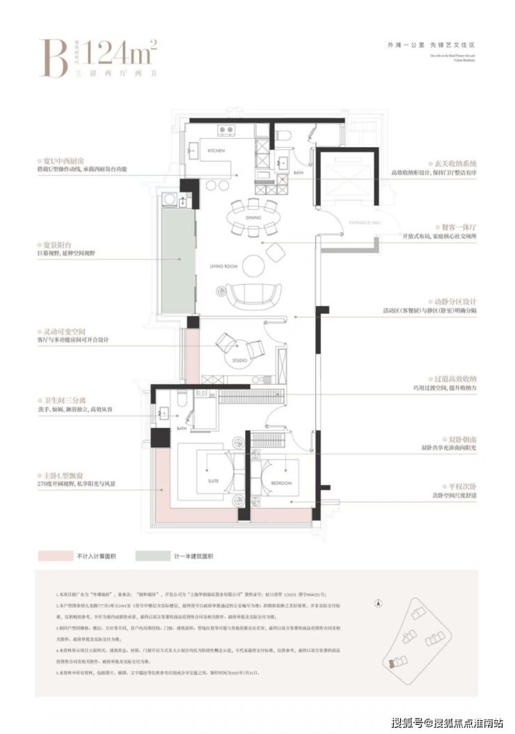 建面约124㎡的边厅“全景舱”户型,是外滩板块极致稀缺的臻品。它以三房布局满足主流家庭需求,更以无遮挡的视野与巨幕般的边厅落地窗,将城市天际线化为私藏画卷。主卧270°L型飘窗,让阳光与风景成为生活的主角。
