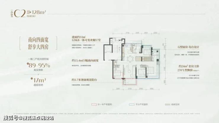 约128㎡「越级洋房」四室两厅两卫,实现了 约89-95%的高实得率 ,将同等面积段产品的空间利用率推至新高度,做到真正的大四卧格局。